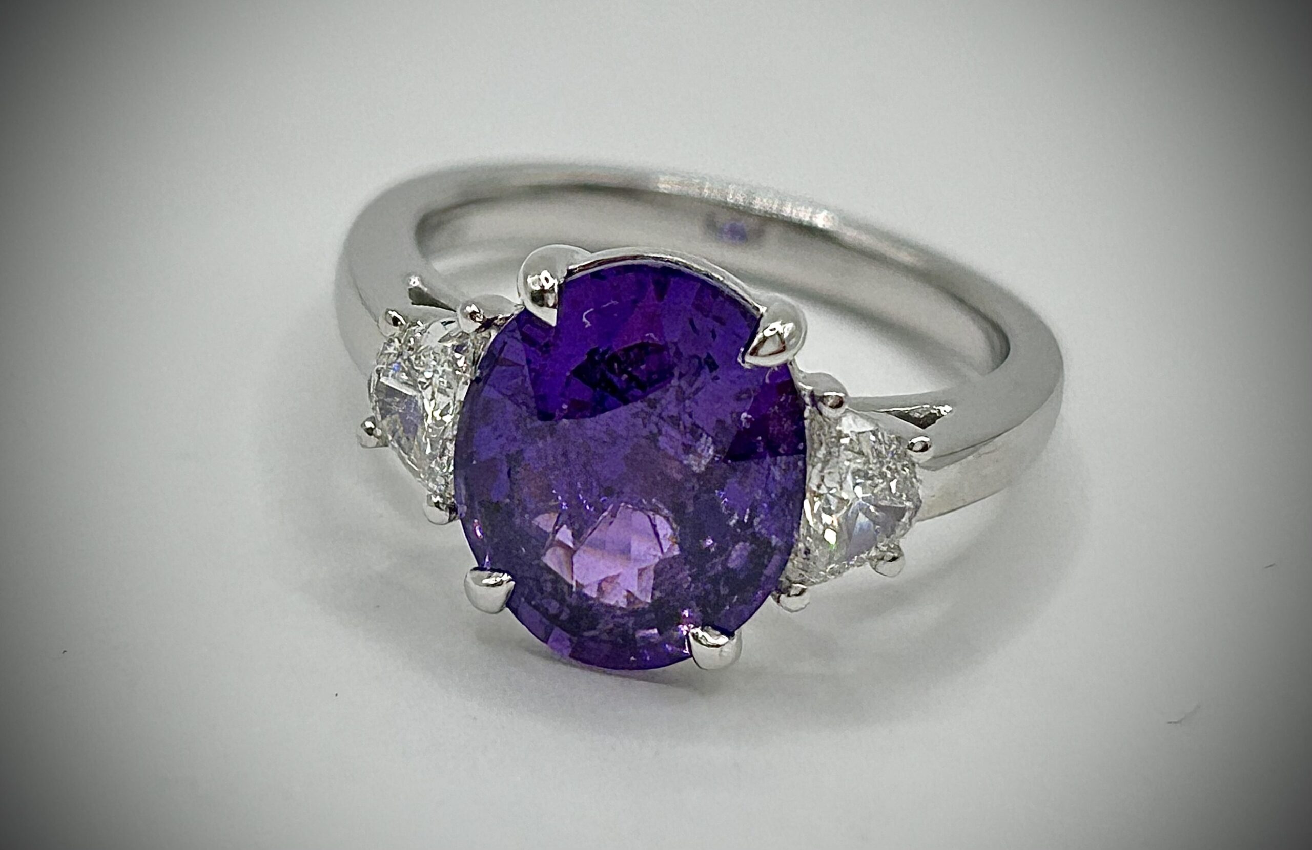 This platinum ring features a stunning 4.61 carat oval purple sapphire at its center & 2 = 0.41 Carats Half Moon Cut F Vs2 Diamonds w/ GIA report!
